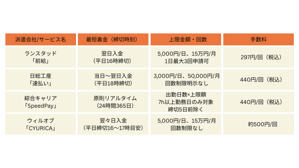 派遣の給料前払いサービス別の違い:前給・速払い・キュリカ・スピードペイの特徴